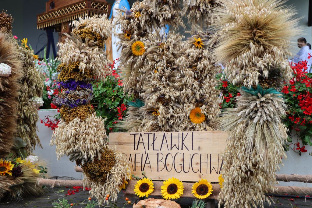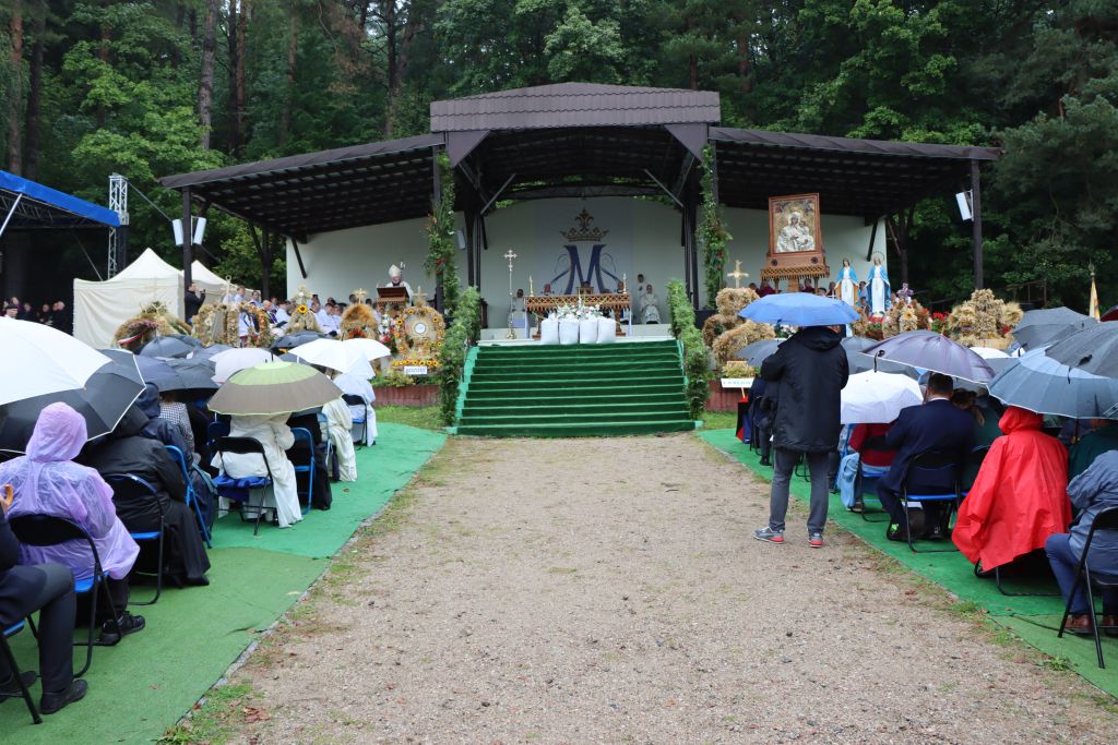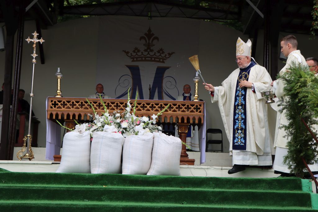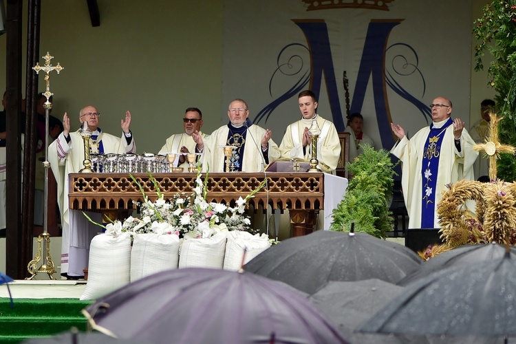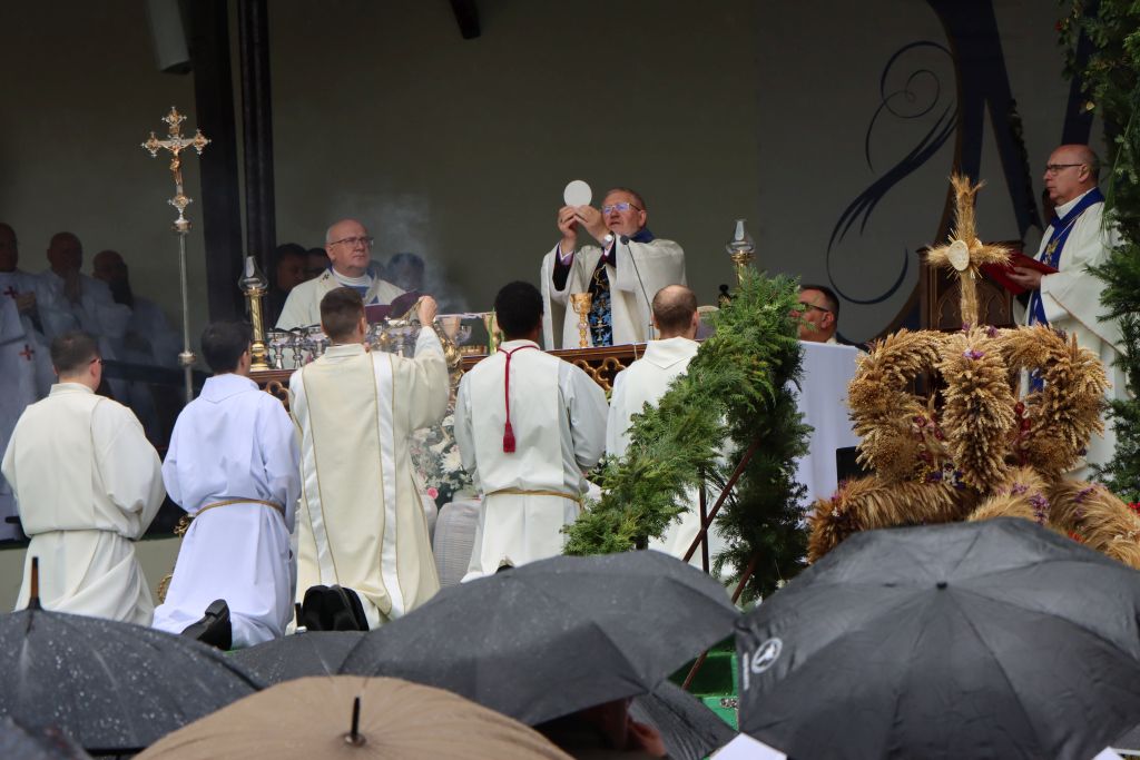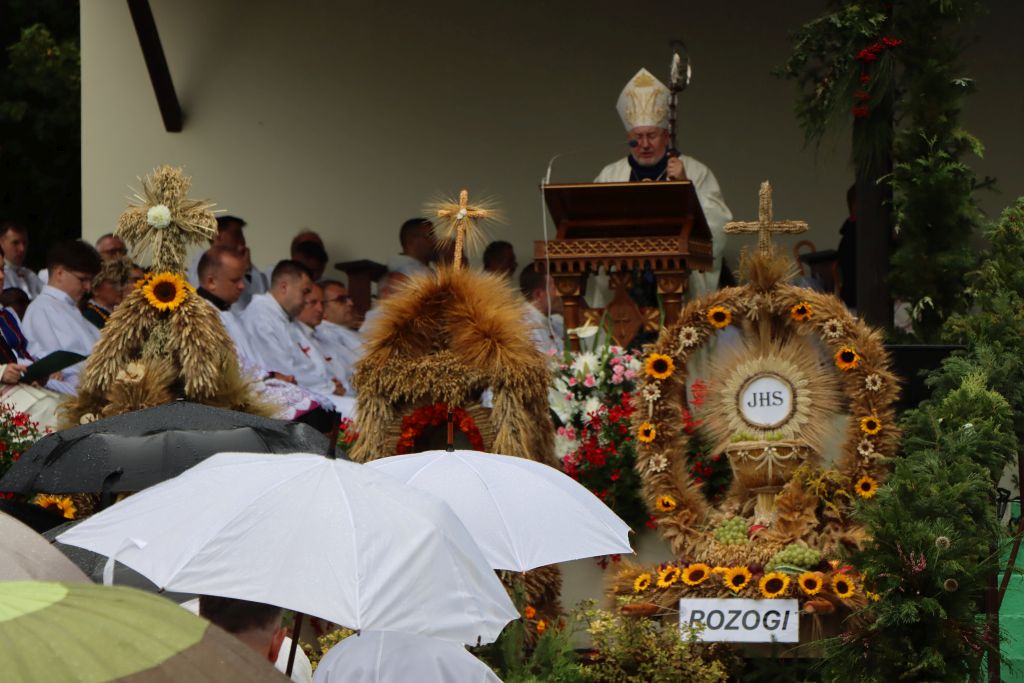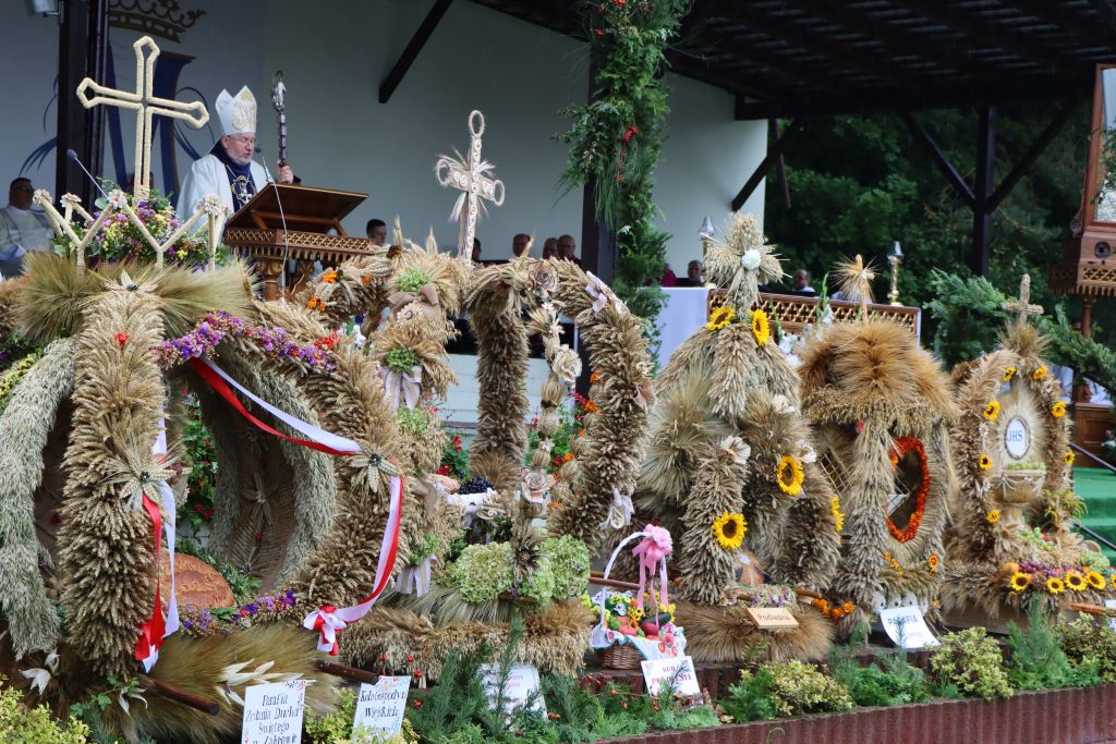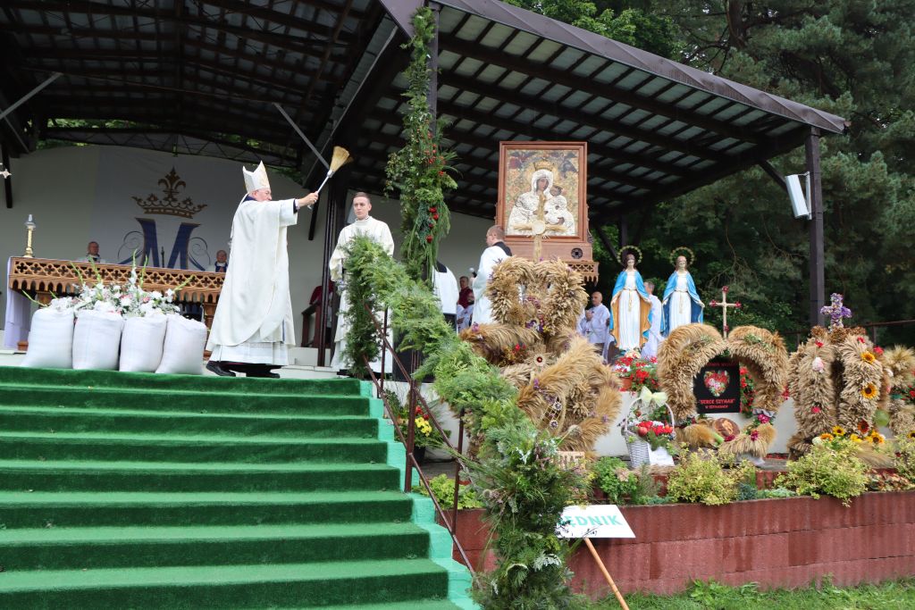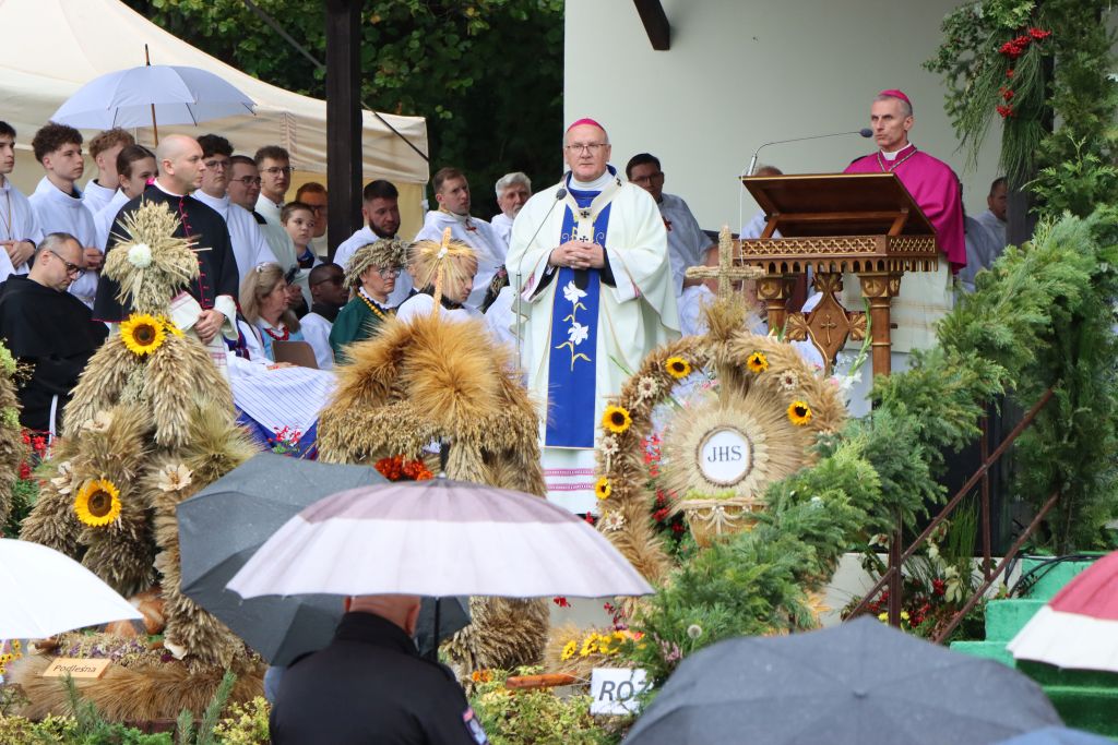 Podkreślał, że w uroczystości odpustowe wpisują się dożynki archidiecezjalne, które są czasem wdzięczności za błogosławieństwo rolnikom pracującym na roli. – W czasie tej Mszy św. pragniemy podziękować rolnikom i wszystkim ludziom, którzy trudzili się przy tegorocznych żniwach. Wam należy się wdzięczność i szacunek. Przynieśliście przepiękne, misternie wykonane wieńce dożynkowe. Starostowie dożynek wręczyli nam dorodny bochen chleba z tegorocznych zbiorów. Pragnieniem ich i naszym jest, by nikomu nie zabrakło chleba powszedniego i by był sprawiedliwie dzielony – mówił bp Mazur.