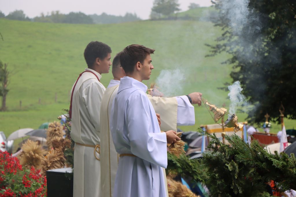 O godz. 11.00 rozpoczęła się Eucharystia, której przewodniczył bp Jerzy Mazur, ordynariusz diecezji ełckiej. Na wstępie Mszy św. przybyłych gości i wiernych przywitał gospodarz diecezji abp Józef Górzyński. – Witam was bardzo serdecznie. Spotykamy się na naszym gietrzwałdzkich uroczystościach, aby również świętować narodzenie Najświętszej Maryi Panny, Pani Gietrzwałdzkiej. Przekładamy Jej intencje dziękczynno-błagalne – mówi pasterz. – Do indywidualnych dołączamy wspólne, za Polskę, Kościół powszechny i za naszą warmińską diecezję. Wśród wypraszanych darów pozostaje dar pokoju, oby spłynął obficie na wszystkich, którzy go oczekują z tęsknotą. Dołączamy nasze dziękczynienie Bogu za tegoroczne plony. W znakach dożynkowych wieńców dziękujemy za Boże dary. Zapraszam wszystkich do wspólnej modlitwy – mówił metropolita warmiński.
