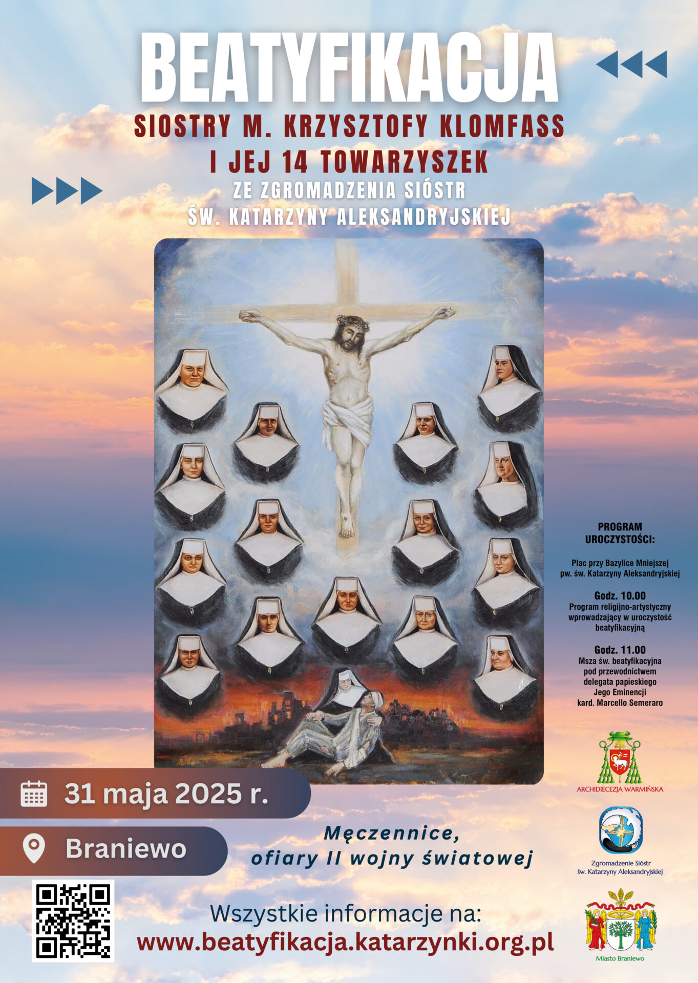 Z wielką radością informujemy, że Stolica Apostolska potwierdziła datę beatyfikacji Siostry Marii Krzysztofy Klomfass i jej 14 Towarzyszek ze Zgromadzenia Sióstr Świętej Katarzyny, która będzie miała miejsce w Braniewie, 31 maja 2025 roku o godz. 11.00. Liturgii przewodniczyć będzie prefekt watykańskiej Dykasterii Spraw Kanonizacyjnych, kard. Marcello Semeraro. Zapraszamy do udziału w tej uroczystości. Szczegóły na plakacie.